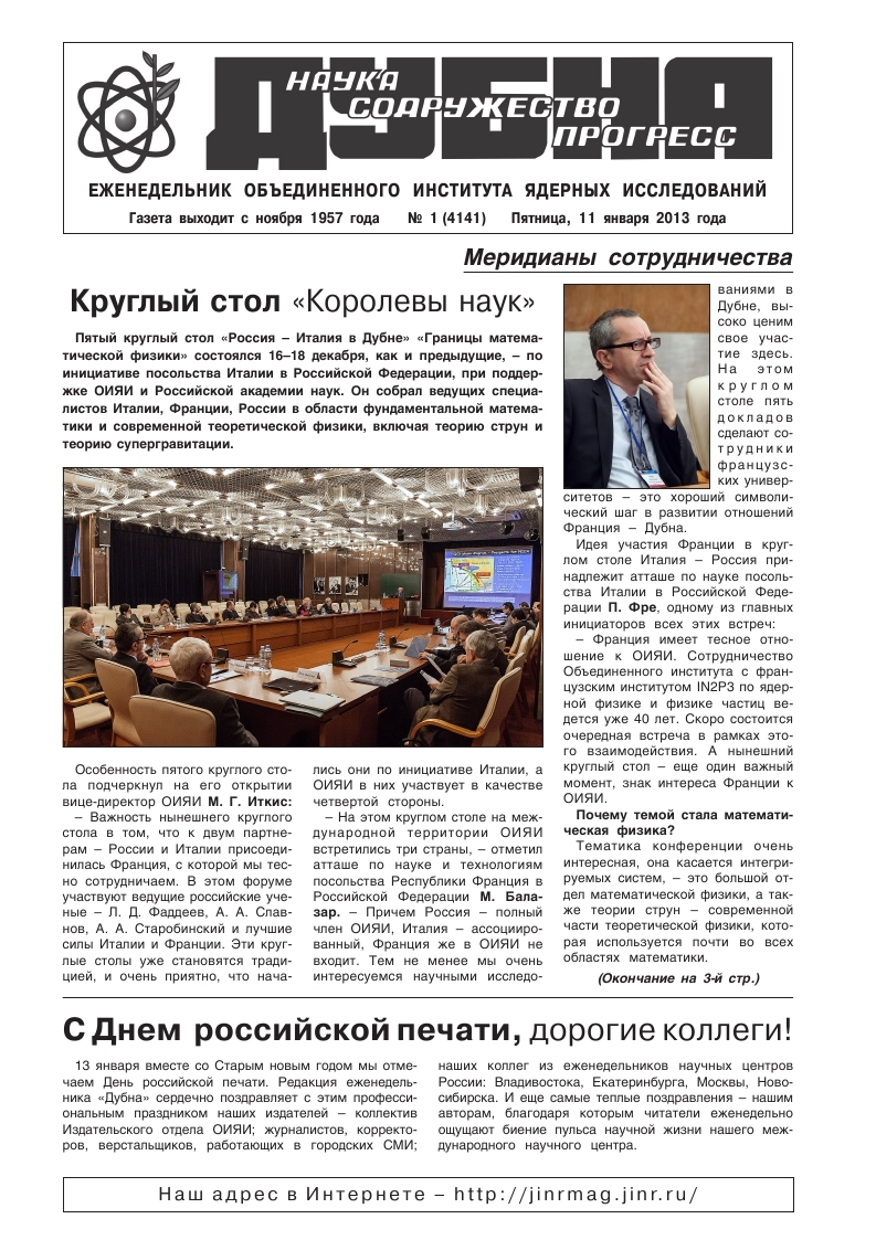 Weekly newspaper "Dubna: science, community, progress" (Issue 1, 23 January 2013)